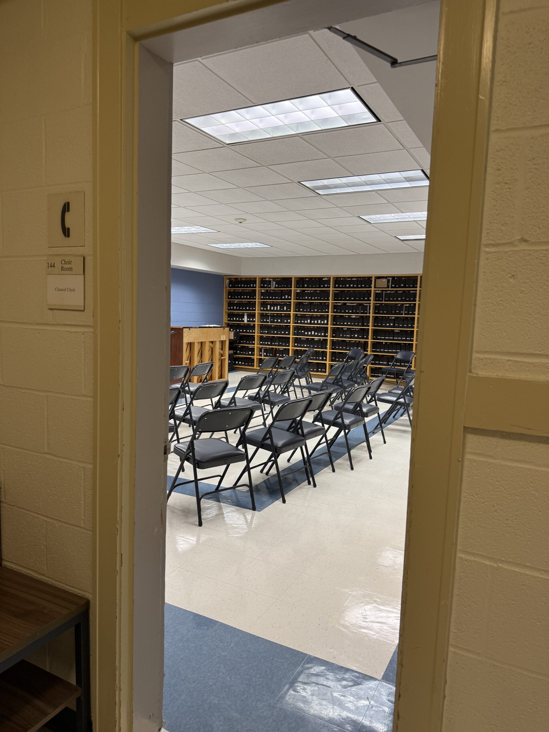 1. Go through Sanctuary on left side to access stairwell to basement Choir Room